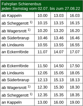 Nach der Premiere im Vorjahr wird es auch 2022 regulären Personenverkehr auf der Strecke Süderbrarup-Kappeln geben. Wir werden in den Monaten Juli und August an Samstagen mit unseren beiden Schienenbussen drei Mal zwischen Eckernförde und Kappeln pendeln. Am, im letzten Jahr extra für diese Fahrten errichteten, Bahnsteig in Lindaunis wird auch wieder gehalten. Dieses Jahr werden wir zusätzlich auch in Scheggerott und Wagersrott halten (als Bedarfshalt).